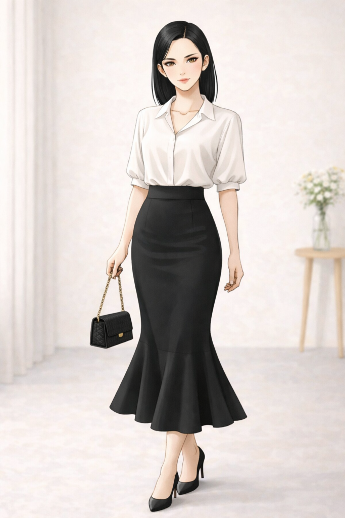 では、直線要素が多く、かっこいい印象の女性がマーメイドスカートを履く場合はどうでしょうか?