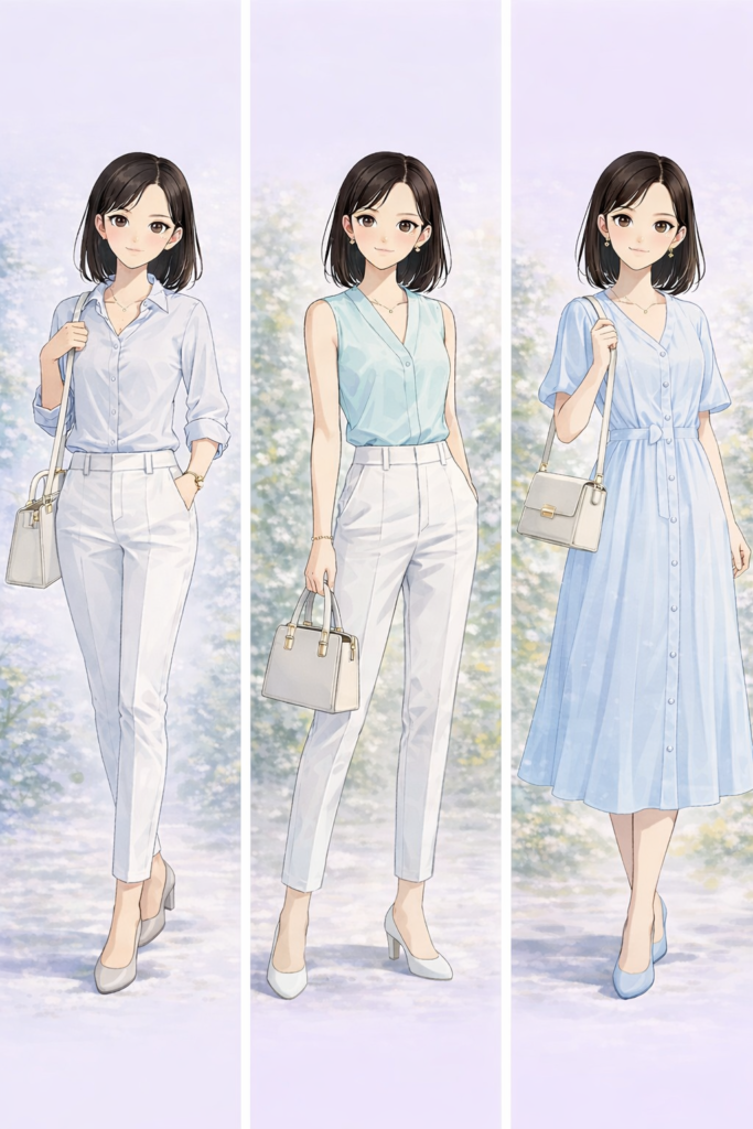 春色×直線シルエットで“軽やかで爽やか”な印象に
