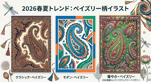2026年はボヘミアンテイストの復活もありペイズリー柄やスカーフ柄が再注目されています。